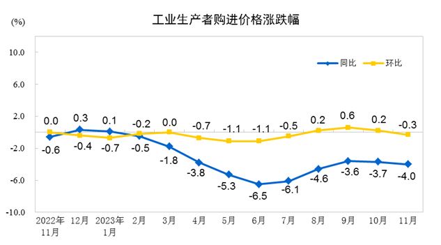 202311月份,全國(guó)工業(yè)生產(chǎn)者出廠價(jià)格同比下降3.0%,環(huán)比下降0.3%;工業(yè)生產(chǎn)者購(gòu)進(jìn)價(jià)格同比下降4.0%,環(huán)比下降0.3%111月平均,工業(yè)生產(chǎn)者出廠價(jià)格比上年同期下降3.1%,工業(yè)生產(chǎn)者購(gòu)進(jìn)價(jià)格下降3.6%。